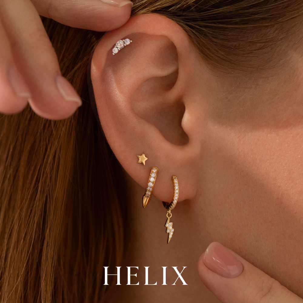 Helix piercings can be worn with flat-back studs, barbells or cartilage hoops, making them easy to adapt to different ear shapes and styling preferences.